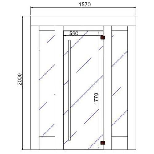 - Façade en verre de sécurité teinté avec porte 1770 mm x 590 mm x 8 mm comprenant des charnières brunes/ poignée en cèdre rouge et 2 fenêtres latérales en verre trempé de 8 mm.