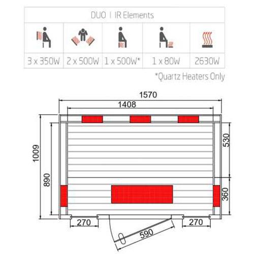 - Radiateurs infrarouges duo avec grille biseautée et radiateurs rotatifs dans les parois avant, sol chauffant.
