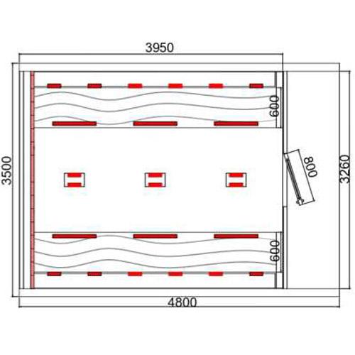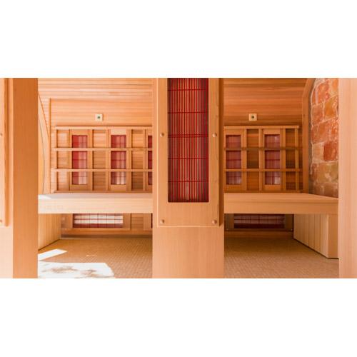 Mur du fond revêtu de pierres de sel brutes avec éclairage indirect.