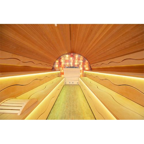 Mur du fond revêtu de pierres de sel brutes avec éclairage indirect.