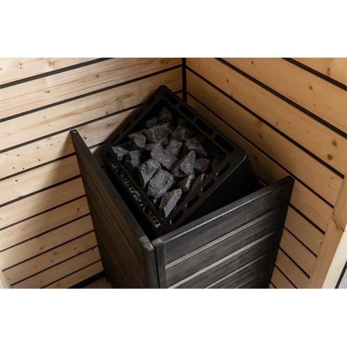 - Finition extérieure et intérieure en pin scandinave avec des lattes noires.