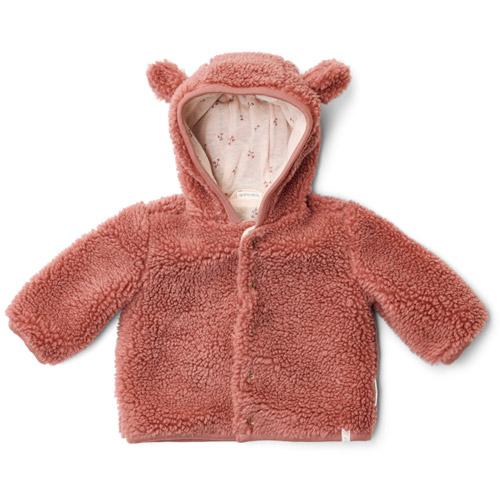 Het is net zo warm als comfortale en heeft een pink blush teddy stof met lieve oren op de capuchon.