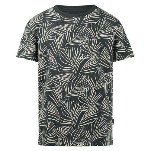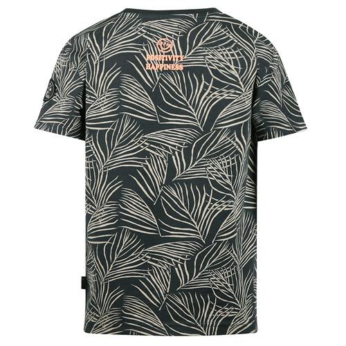 Hey No Way Monday t-shirt in antraciet kleur met koraalaccenten heeft een all-over bladprint die direct een zomerse sfeer uitstraalt.