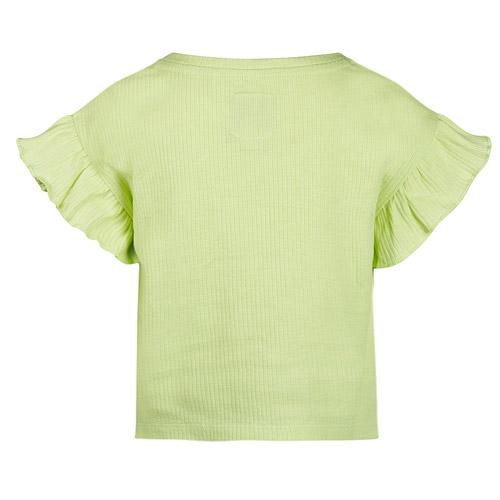Het t-shirt heeft een subtiele ribstructuur en is voorzien van opvallende ruches aan de mouwen, wat een speelse en stijlvolle touch geeft.