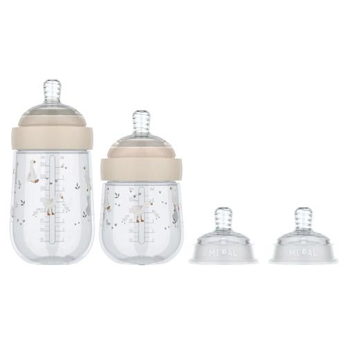 De set bestaat uit twee flessen - van 165 ml en 240 ml - en twee medium flow spenen, ideaal om rustig te starten en met je baby mee te groeien.
