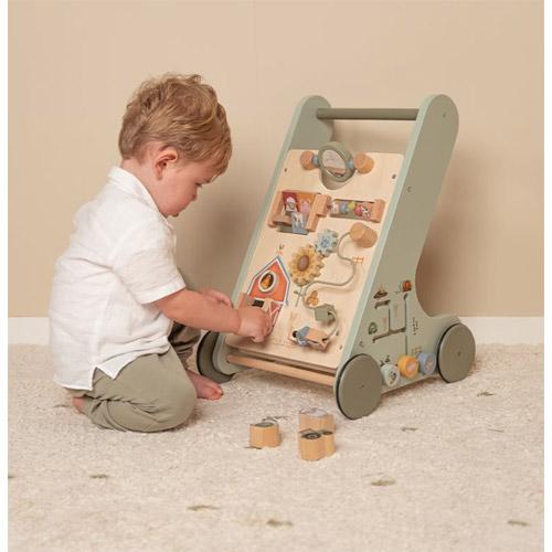 Deze houten activiteiten loopwagen biedt verschillende uitdagende activiteiten die de ontwikkeling van jou kindjes motoriek ondersteunen.