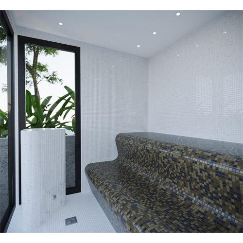 Interior finish: walls, bench, freestanding unit, and pedestal in rigid EPS foam tiled with Ezarri mosaic.