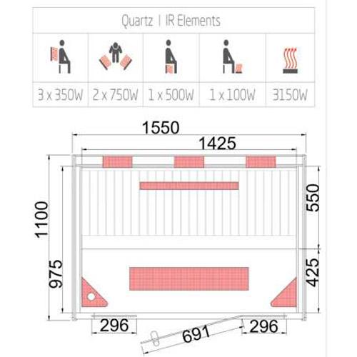 - Radiateurs infrarouges en quartz, sol chauffant, y compris des radiateurs rotatifs dans les murs latéraux.