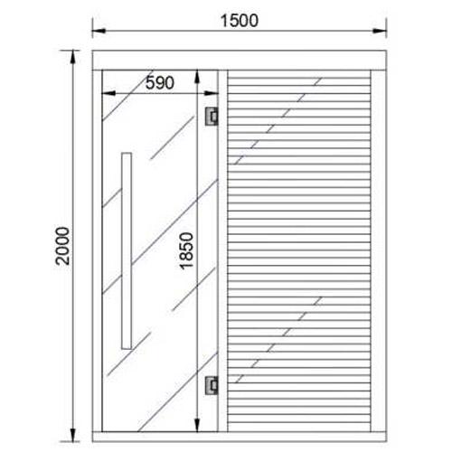 - Façade et côtés en verre trempé clair de 8 mm d'épaisseur, porte comprise 1850 mm x 590 mm x 8 mm, poignée extérieure en acier inoxydable et intérieure en bois.
