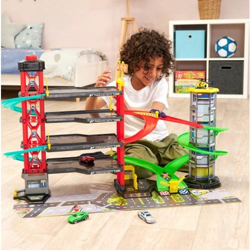 Grand garage à 5 étages avec ascenseur, circuit de course, petites voitures, hélicoptère, effets sonores et lumineux.