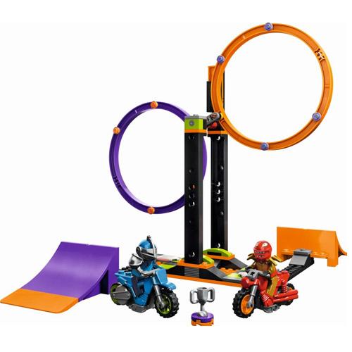 Inhoud doos : Twee hellingen, Twee motoren, Twee figuren, Dubbele stuntcirkel, trofee en stunthoofddeksel.